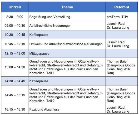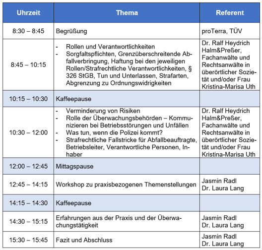 Das Referententeam besteht aus Sachverständigen mit entsprechenden Erfahrungen in den Bereichen Abfallrecht, Zertifizierung von Entsorgungsfachbetrieben, Transportrecht.