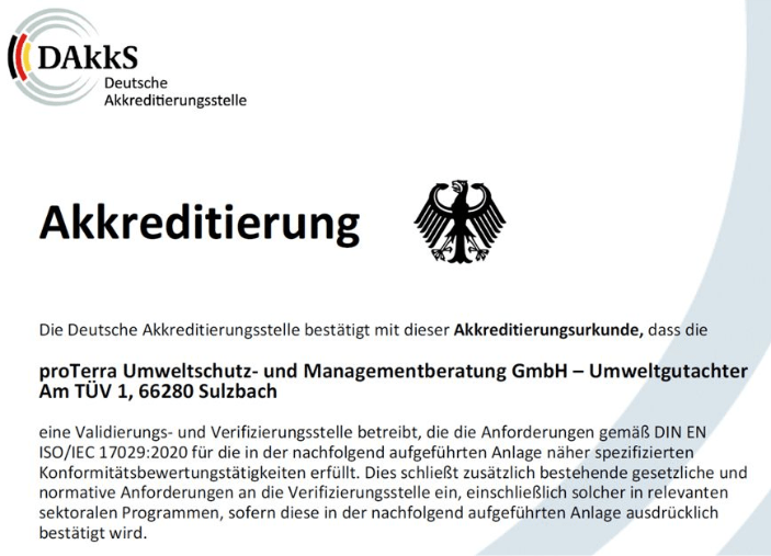 Am 10. November 2025 haben wir unsere neue Akkreditierungsurkunde von der Deutschen Akkreditierungsstelle (DAkkS) erhalten. Damit dürfen wir nun offiziell Verifizierungen im europäischen Emissionshandelssystem EU-ETS 2 für Inverkehrbringer durchführen (Kapitel IVa der Richtlinie 2003/87/EG). Diese Akkreditierung bestätigt, dass wir die hohen Anforderungen der DAkkS erfüllen und Unternehmen künftig dabei unterstützen können, ihre Emissionsberichte rechtskonform und zuverlässig zu verifizieren.